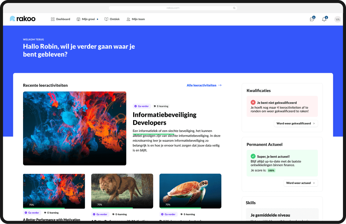 Bij Rakoo draait alles om de persoonlijke doelen van de gebruiker. We bieden leer-activiteiten om deze doelen te bereiken, maar de medewerker bepaalt zelf waarover, wanneer en hoe die leert – via computer, telefoon of tablet, via desktop